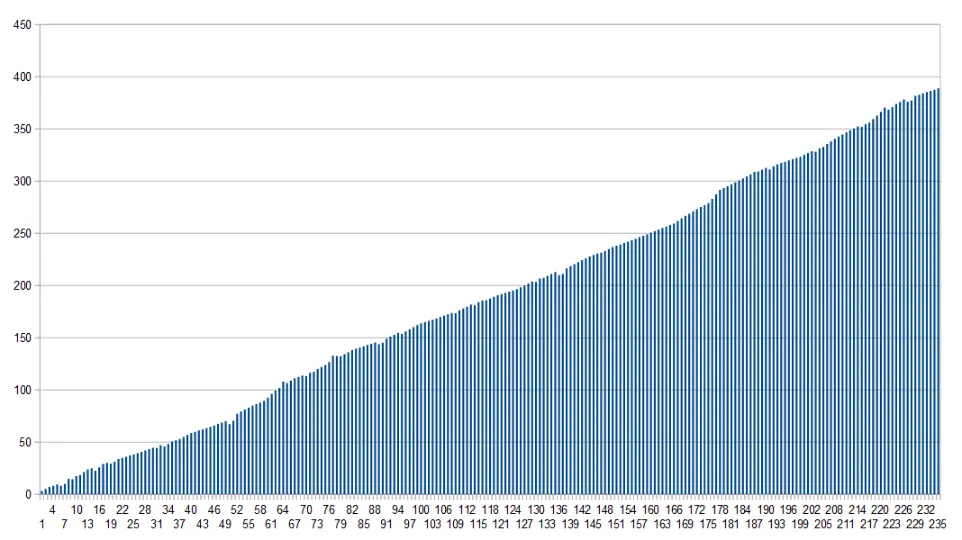 This chart shows profits trade-by-trade, 388 Eur. 500 Eur start cap would be feasible , resulting in 77 % profit.